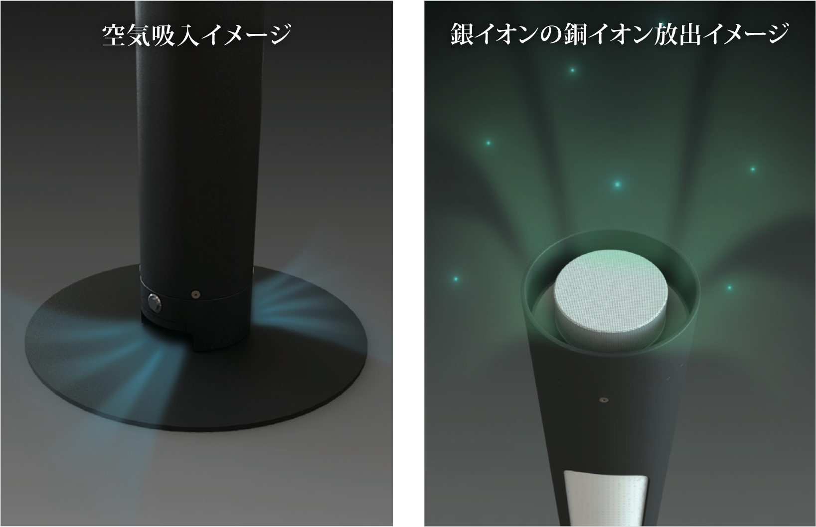 さらに、特許技術の「光触媒に配合した銀イオン、銅イオン」が帯電により空気中にすみずみまで浮遊し空間を除菌していきます。 -