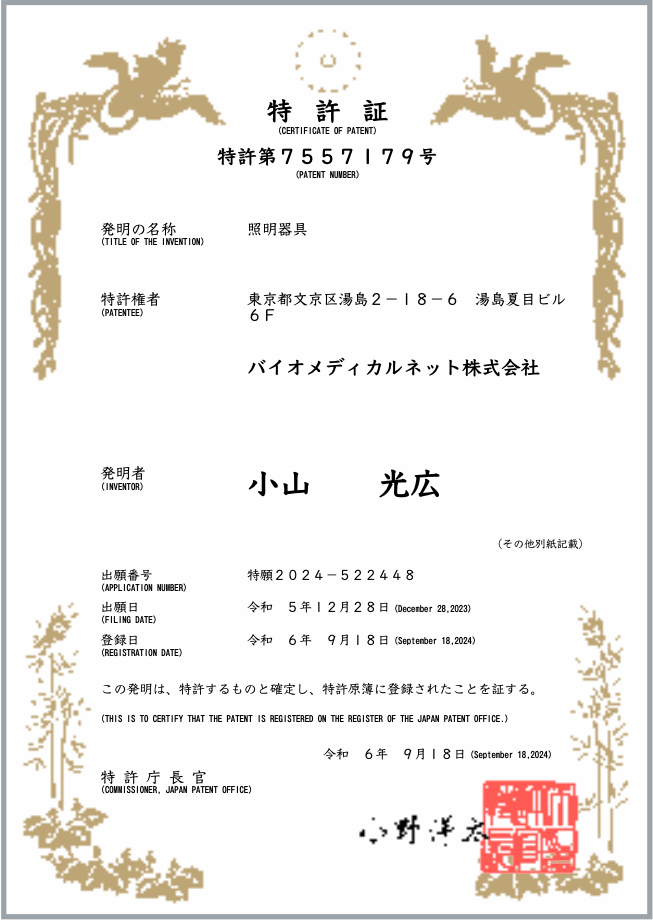 第三者機関で、大腸菌や黄色ブドウ球菌、サルモネラ菌、レジオネラ菌、緑 膿菌、枯草菌芽胞、カンジタ菌、陽炎ビブリオ、リステリア菌に対して、33m2の容積空間で2mからの光照射で24時間で99.9%を除菌